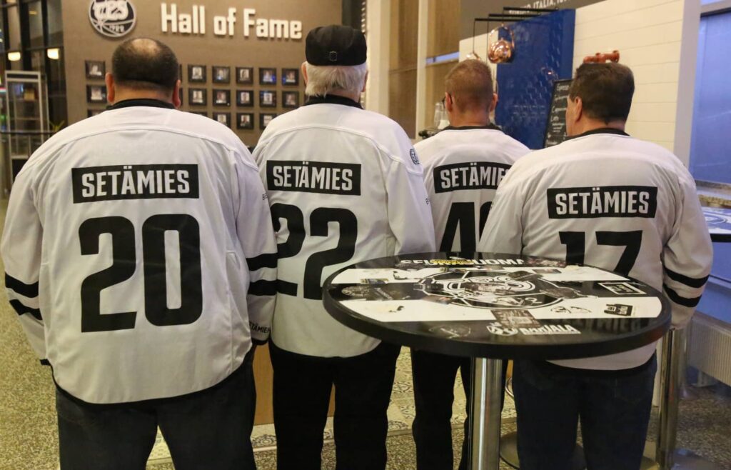 Tuttu näky Turkuhallissa. Neljä varttuneempaa TPS:n fanipaitaan sonnustautunutta herrasmiestä valmistautuu hyvissä ajoin illan otteluun. Jokaisen pelipaidan selkämykseen on ikuistettu nimi SETÄMIES.
