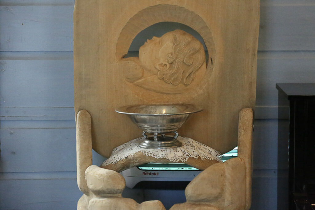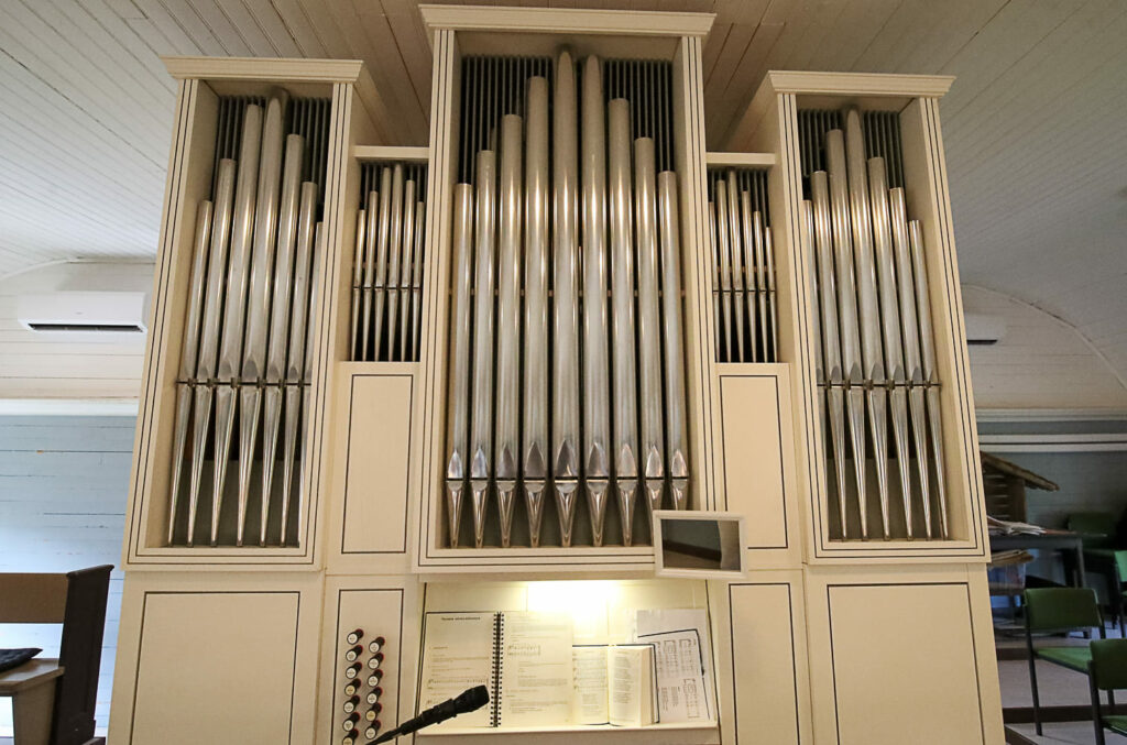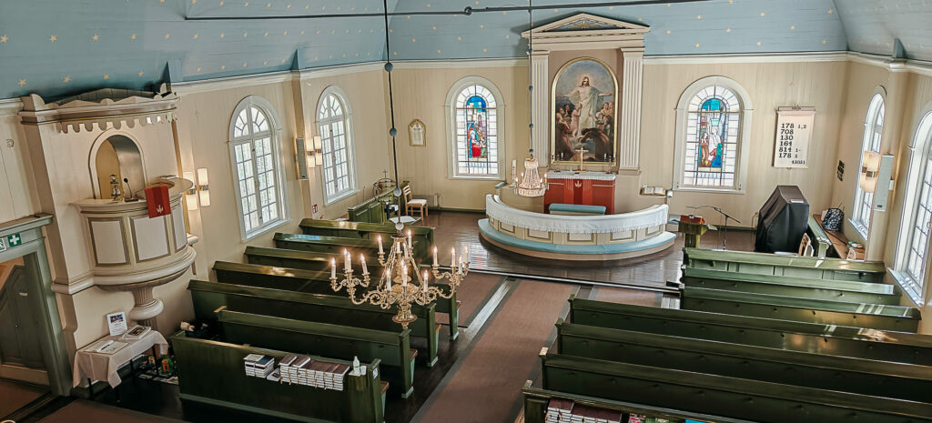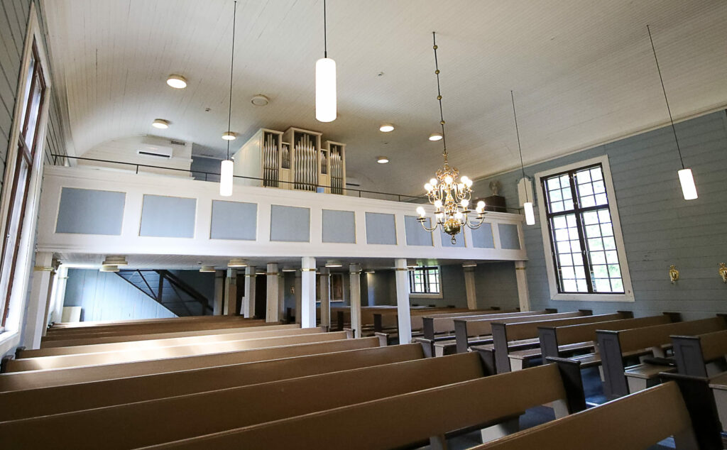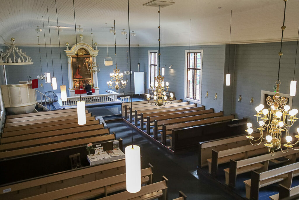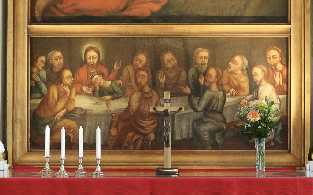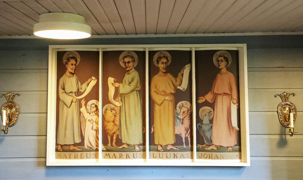 Kirkkosalin takaosassa on esillä Alla Lehtisen vuonna 1935 maalaamat apostolien kuvat.