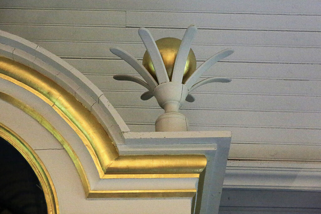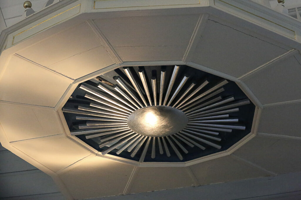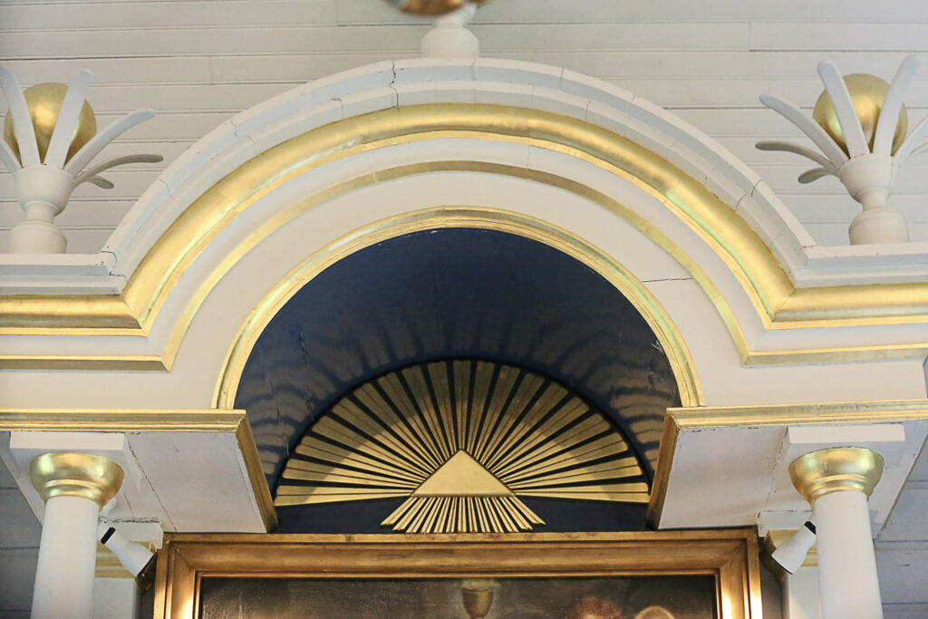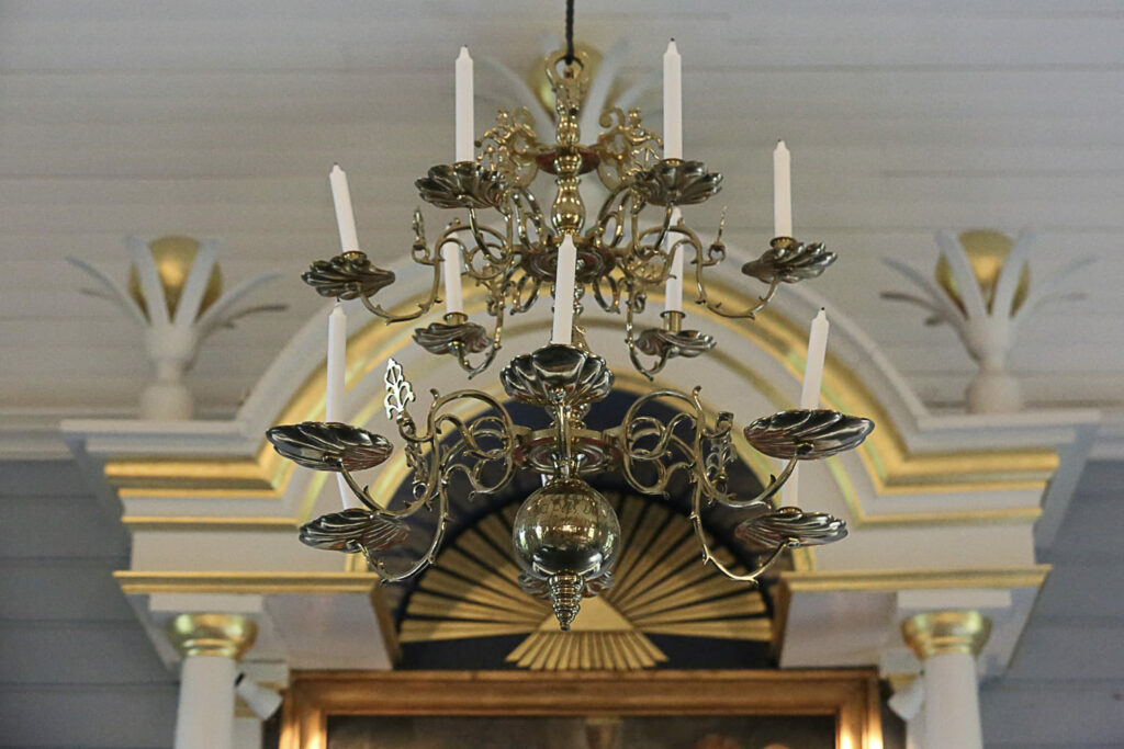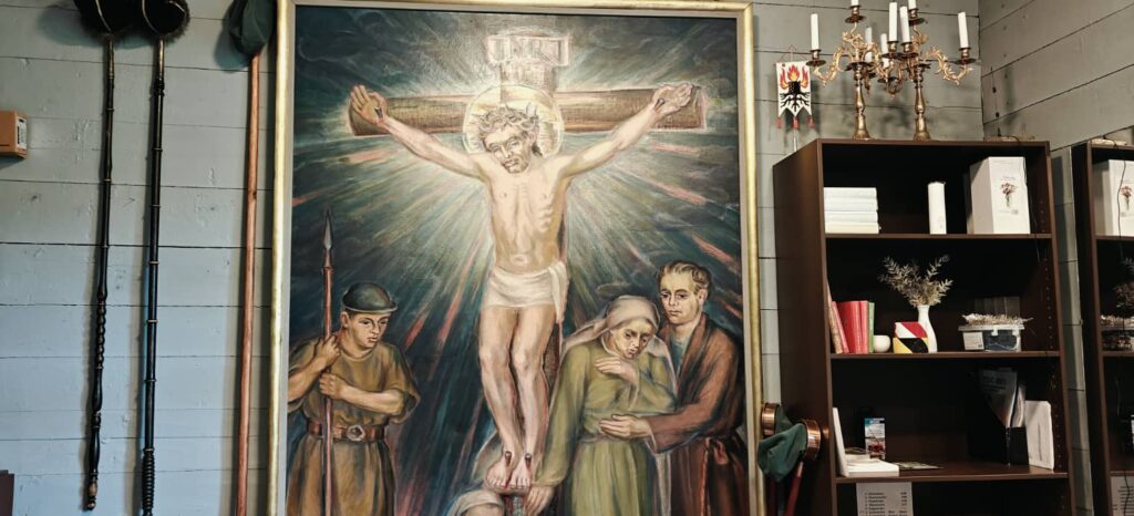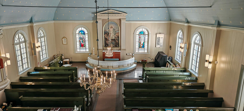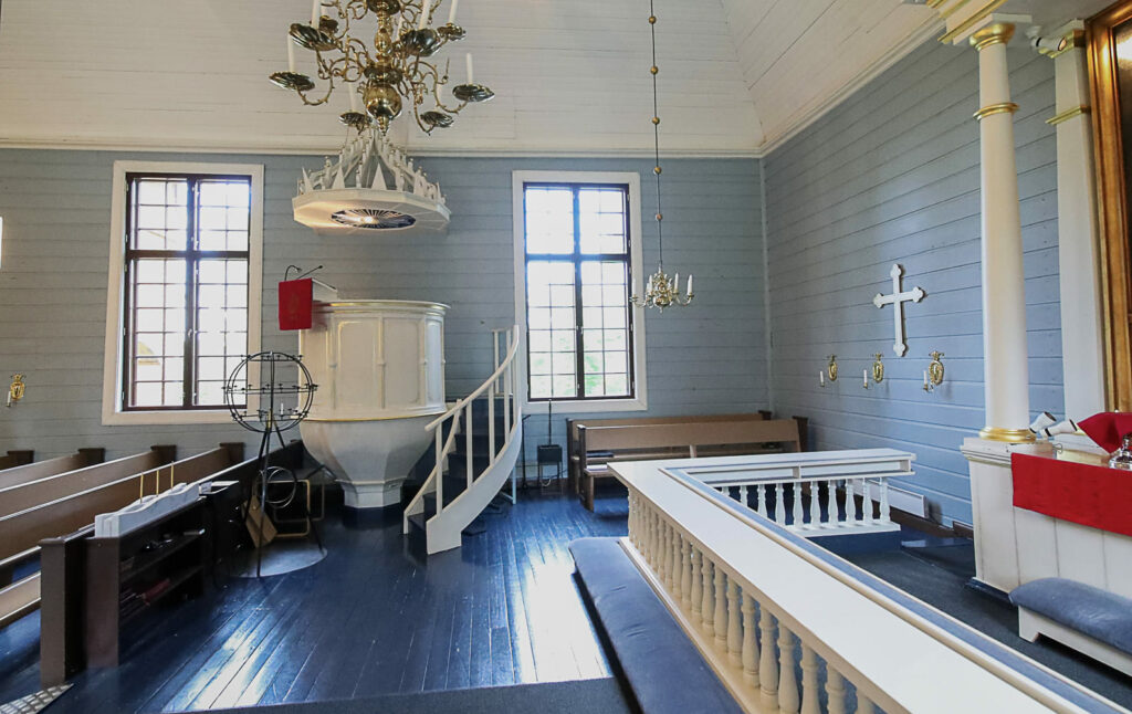Kirkkosalin takaosassa on esillä Alla Lehtisen vuonna 1935 maalaamat apostolien kuvat.