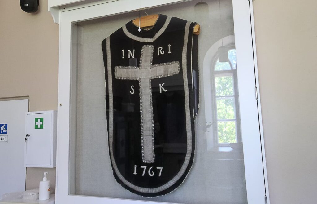 Kauniit kattokruunut on saatu lahjoituksina. Kaappikello on 1600-luvulta. Sakastin puolelta lasivitriineissä on esillä kaksi vanhaa messukasukkaa.