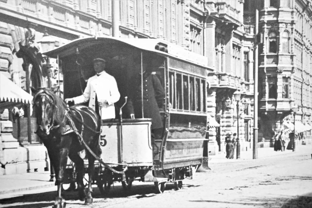 Säännöllinen hevosten vetämä raitioliikenne alkoi Helsingissä vuonna 1891. Aluksi ei ollut pysäkkejä, vaan vaunuun saattoi nousta reitin varrelta. Jo vuonna 1900 voimanlähteeksi otettiin sähkö. Henkilöautot olivat vielä harvinaisia.
