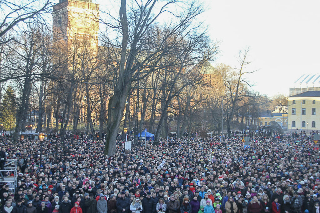 VARSINAIS-SUOMI / TURKU – Yleisö on saapunut Turun Vanhalle Suurtorille seuraamaan perinteistä joulurauhan julistusta. Kaikkien katse ja TV-kamera on suunnattu kohti Brikkalantalon kuuluisaa parveketta. Kohta, Tuomiokirkon kellojen lyödessä kaksitoista, joulurauhan julistaja astuu kääreineen yleisömeren eteen.
