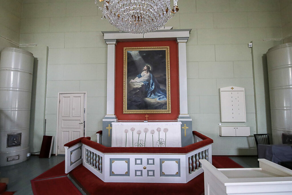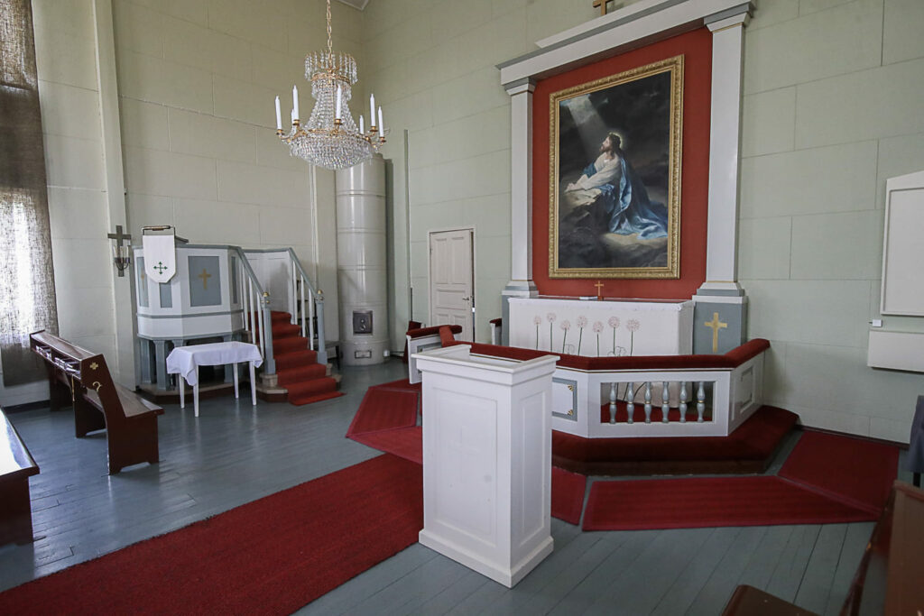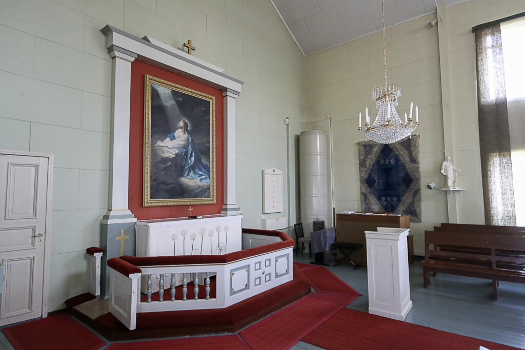 Kirkon esillä olevat esineet on saatu lahjoituksina, kuten vihkiryijy, ehtoollisvälineet, kynttiläjalat, Kristus-patsas jne. Alttaritaulu on vaskiolaisen Armas Lindgrenin vuonna 1892 maalaama. Hän lahjoitti sen kotikirkolleen. Alkuperäisestä rukoushuoneesta on jäänyt tallelle alttaripöytä ja yksi esillä oleva maalaus.