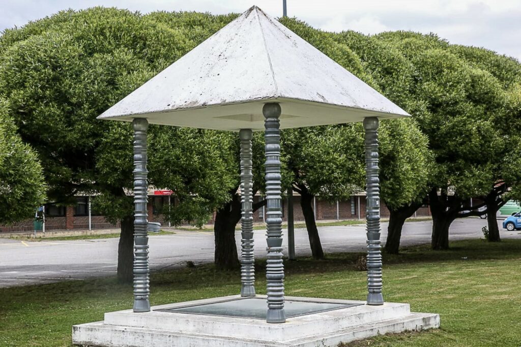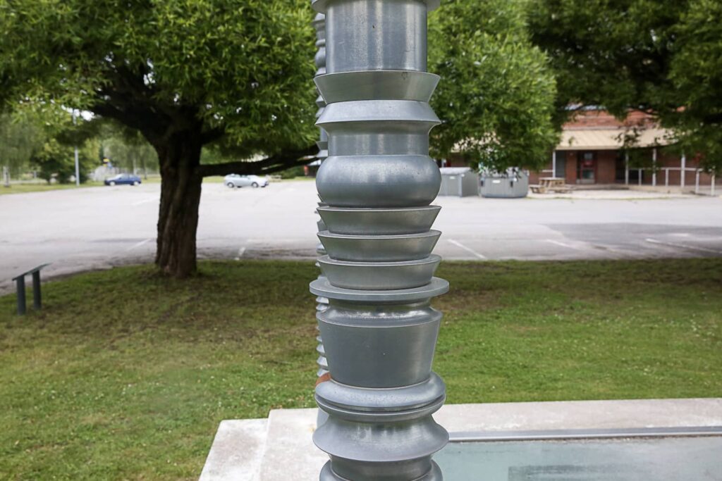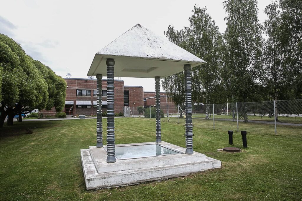Taideteoksen maanpäällinen osa koostuu neljästä muotoon sorvatusta teräspylväästä, jotka kannattelevat pyramidikatosta.