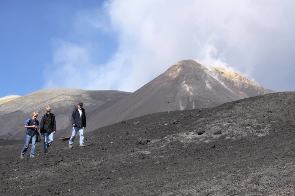 Hissiasemalta kannattaa jatkaa pikkubussilla lähes 3000 metriin. Osa lähtee urheasti kävelemään, mutta se vaatii aikaa. Tie pujottelee kuumaisemassa aurauskeppien välistä. Musta pöly nousee ilmaan ja nenässä tuntuu pistävä rikin tuoksu. Ilma ei sovi astmaatikoille. Parinkymmenen minuutin päästä saavutaan perille. Ympärillä on kraattereita, osasta tupruaa savua. Maanpinta on upottavaa laavahiekkaa. Se tuntuu käteen lämpimältä. Näe rakennuksen, josta on purkauksen jälkeen jäänyt vain katto näkyviin.