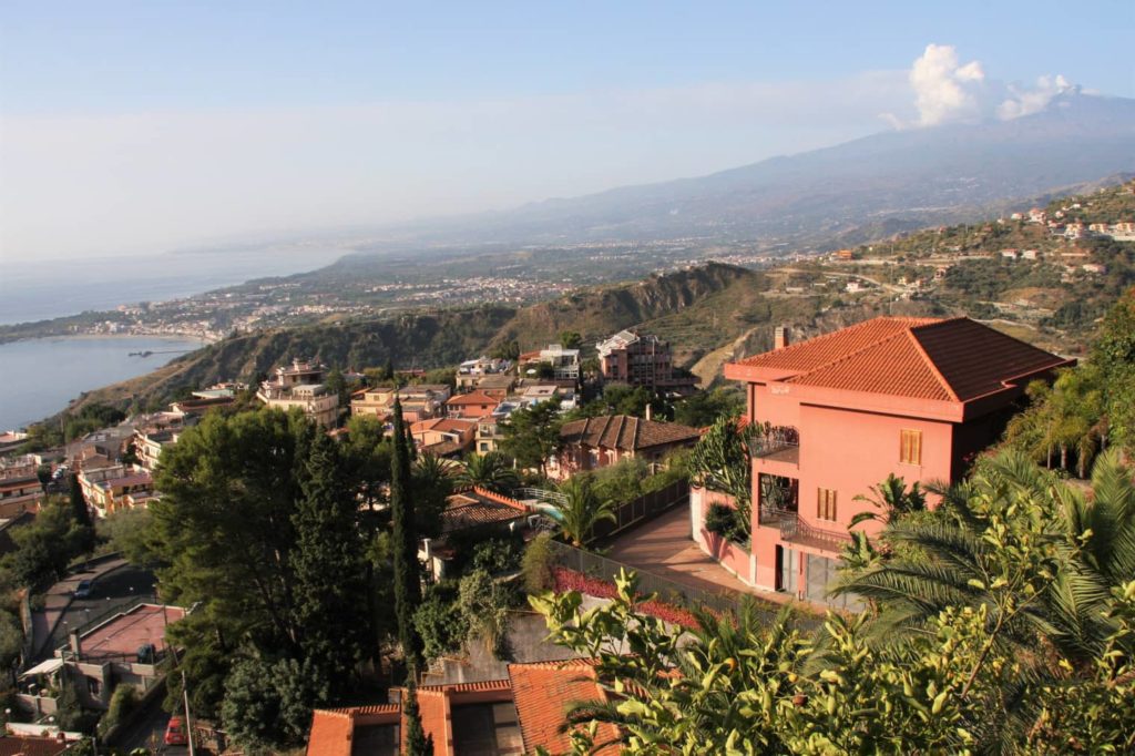 Aamulla päivän valjettua en erota enää hehkuvaa laavaa, mutta Etnan pääkraatteri tupruttaa savua. Hotelli Villa Astoria on muutaman päivän ajan majapaikkani. Täältä on hyvä tehdä retkiä Etnan huipulle ja muualle Sisiliaan.