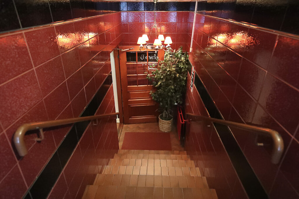 Jo ravintolaan sisääntulo on vaikuttava. Katutasolta laskeudutaan rappusia pitkin rakennuksen kellarikerrokseen. Seiniä koristavat punamustat kaakelit. Väreillä halutaan kunnioittaan Tiitan suvun karjalaisia perinteitä.