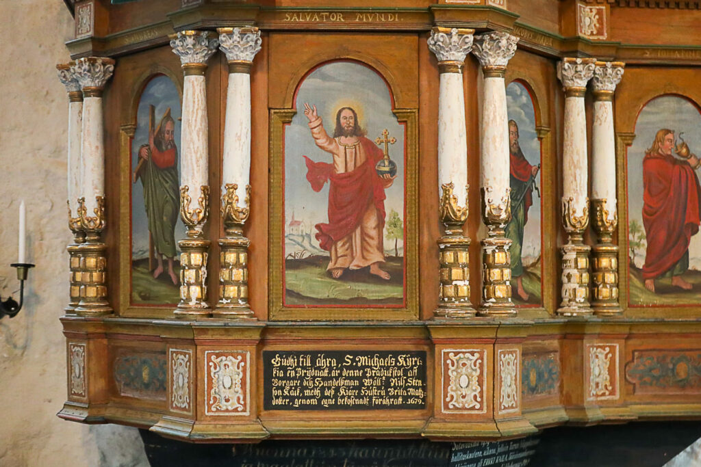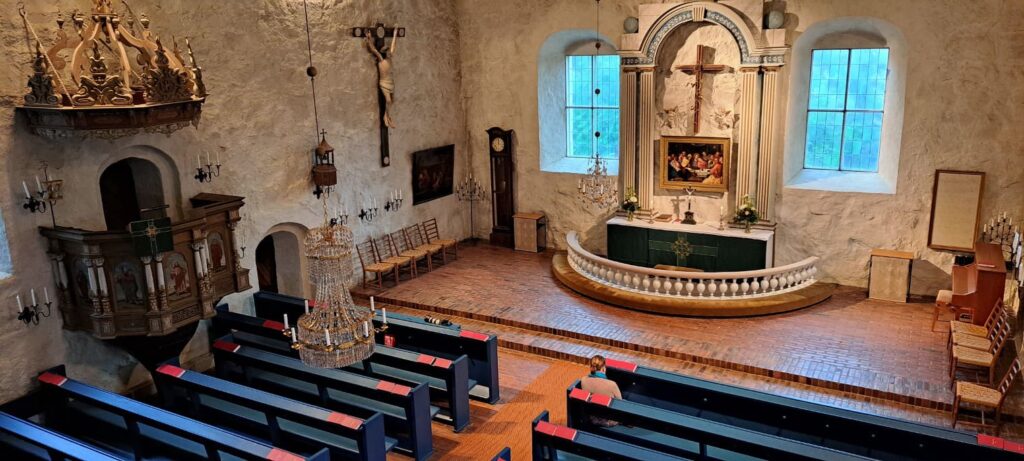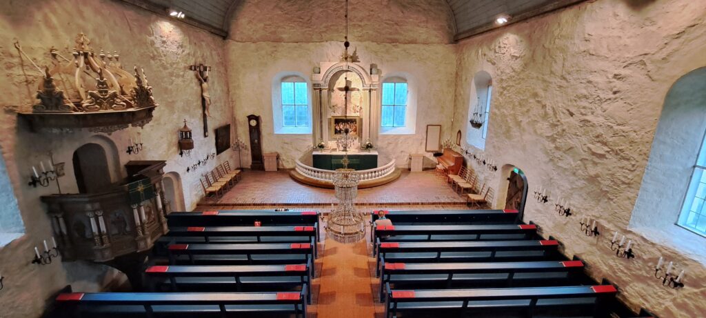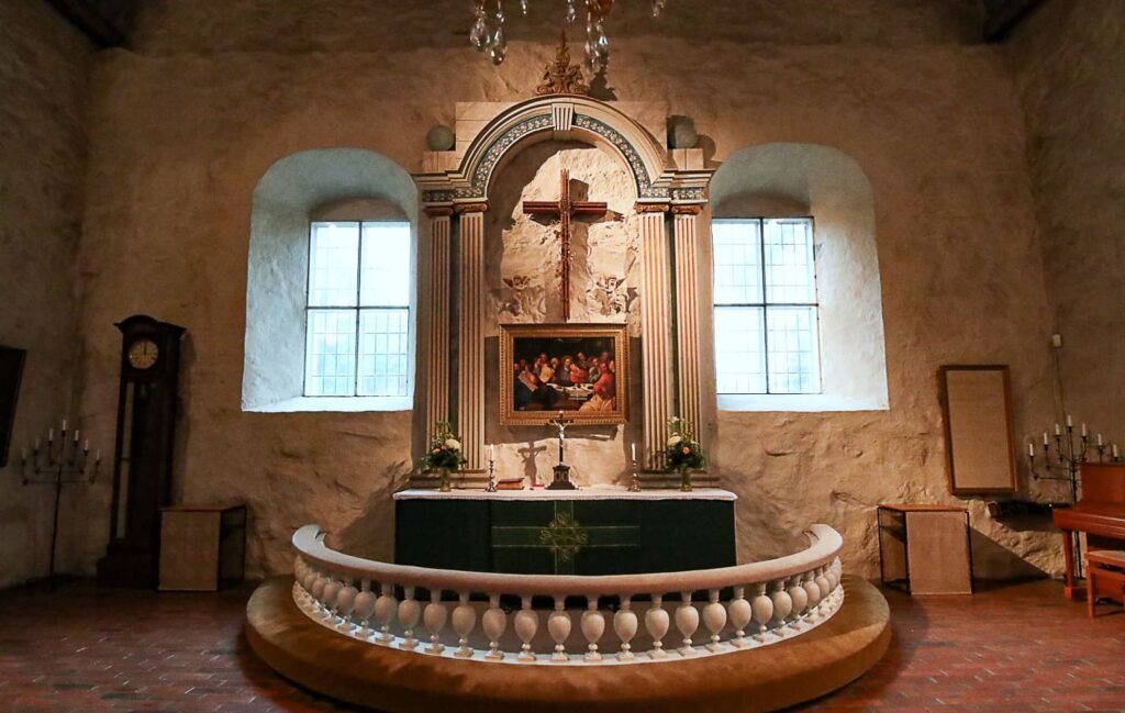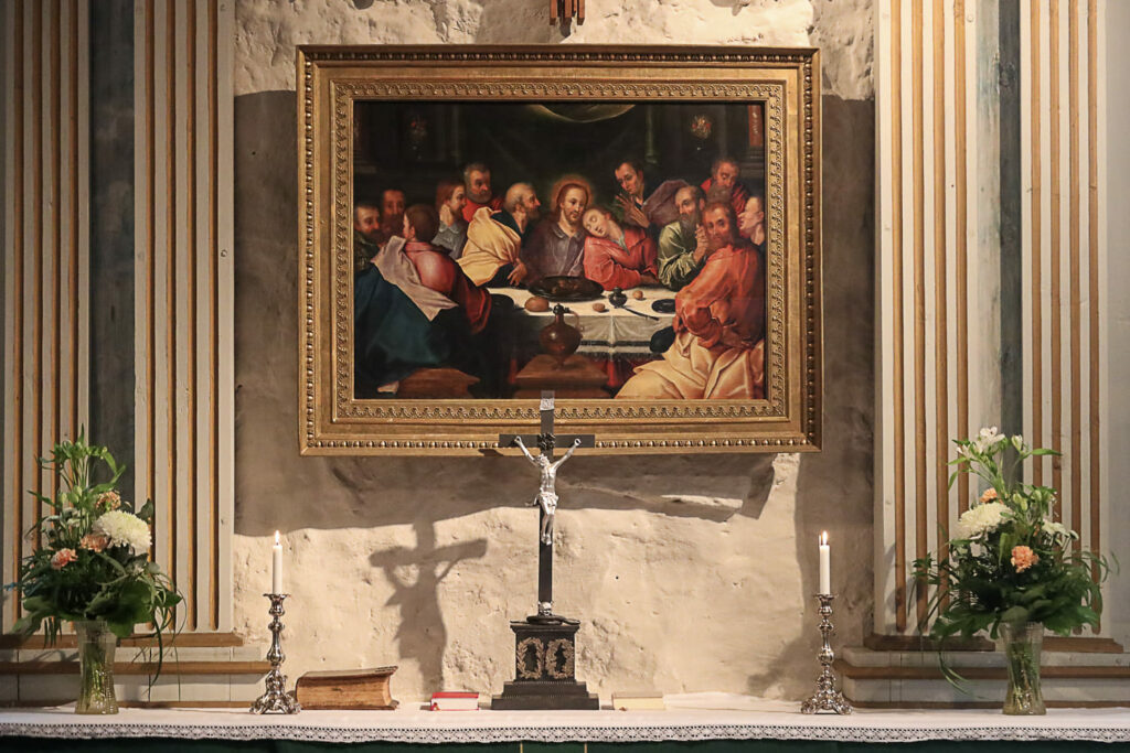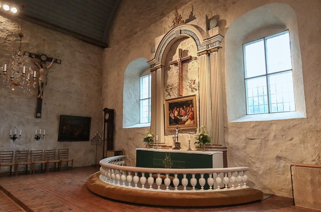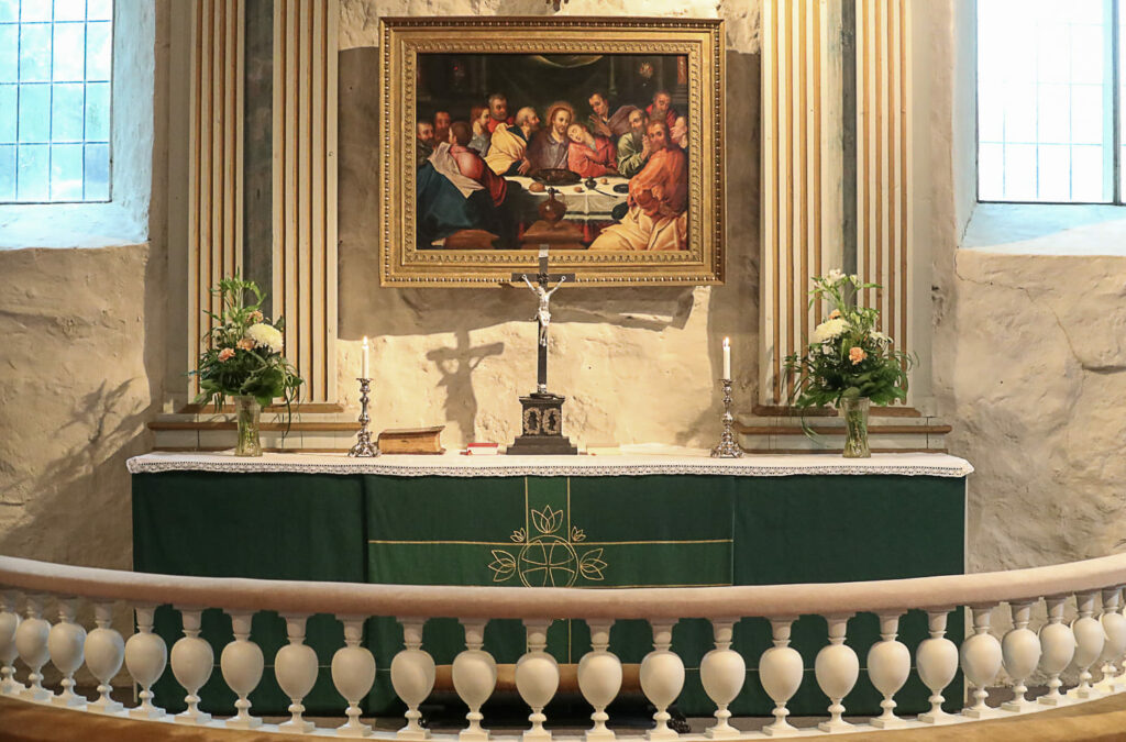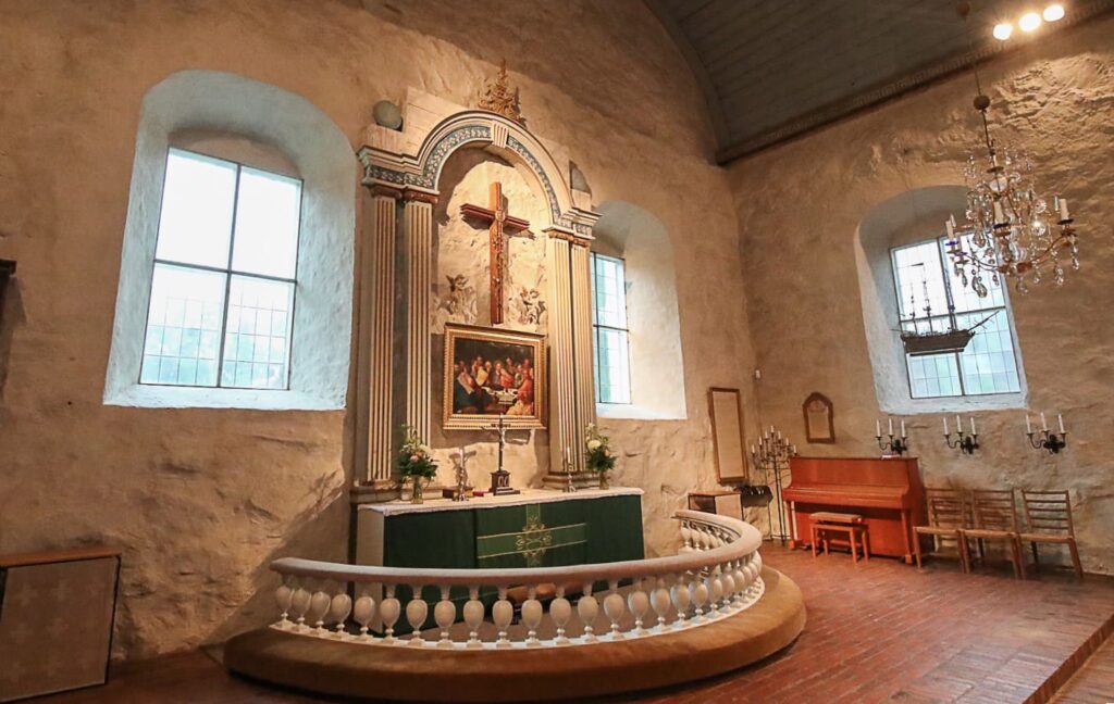 Bryggmanin kädenjälki näkyy myös alttariseinässä, jota koristaa arkkitehdin suunnittelema risti. Värikäs ehtoollista kuvaava taulu on 1600-luvulta. Koska tilaa on pienessä kirkossa rajallisesti, kulku koristeelliseen saarnastuoliin tapahtuu ovelasti sakastin puolelta osin muurin sisällä.