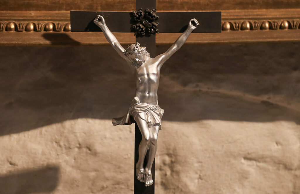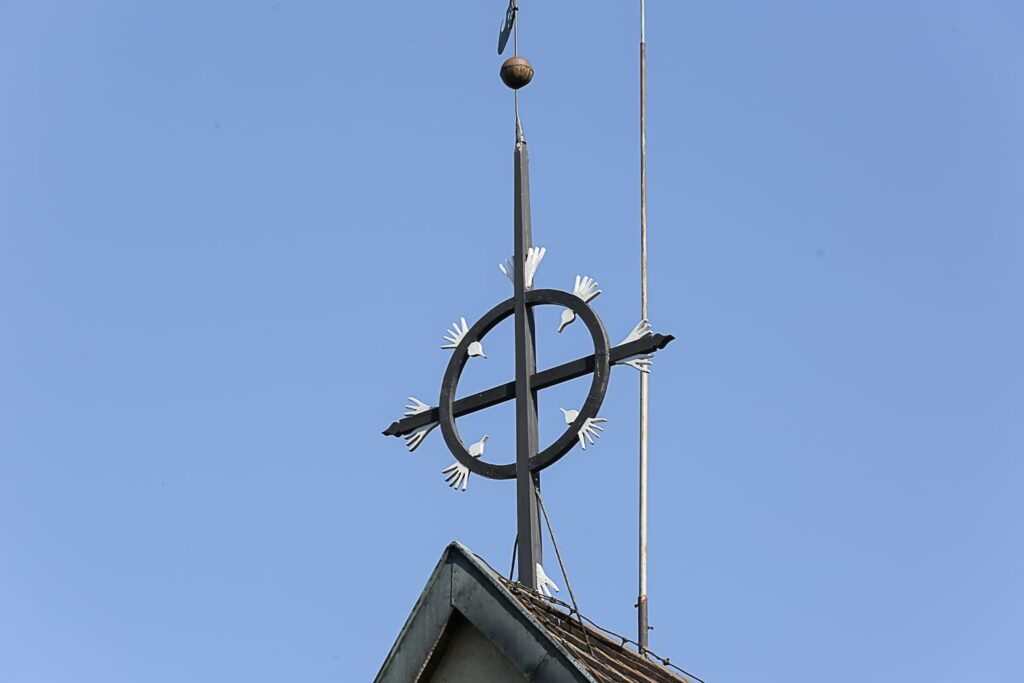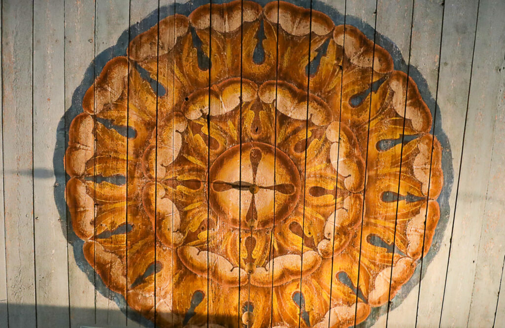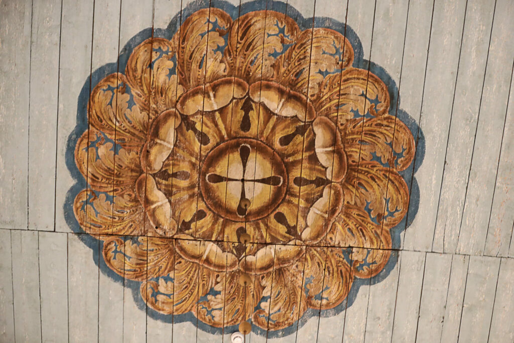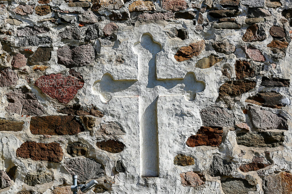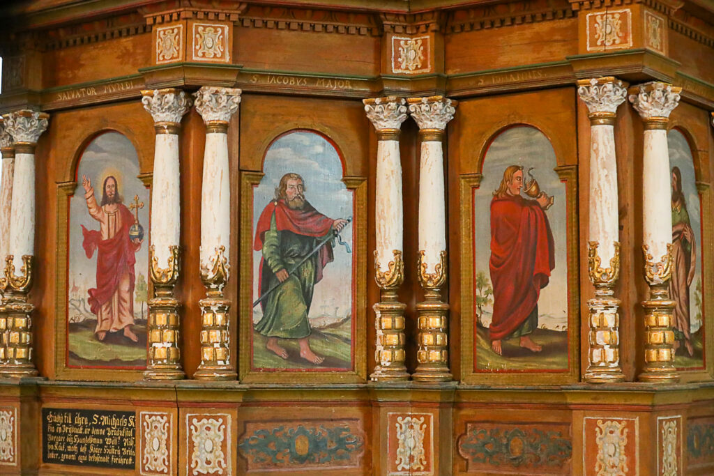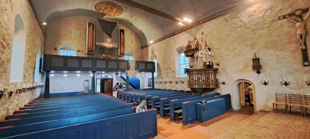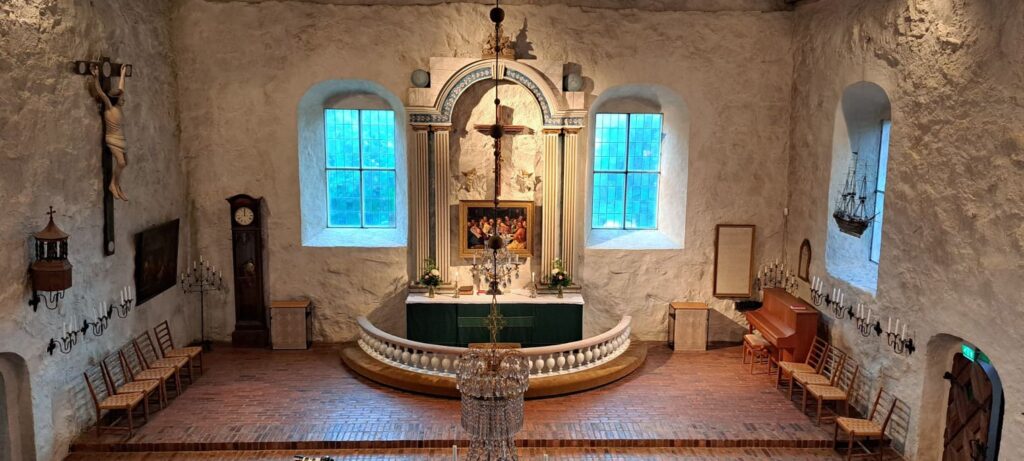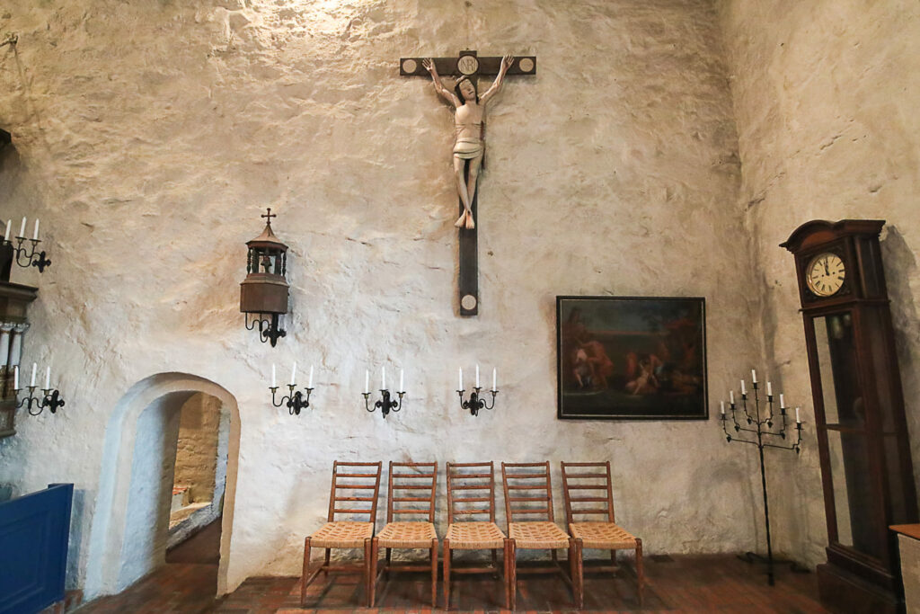 Bryggmanin kädenjälki näkyy myös alttariseinässä, jota koristaa arkkitehdin suunnittelema risti. Värikäs ehtoollista kuvaava taulu on 1600-luvulta. Koska tilaa on pienessä kirkossa rajallisesti, kulku koristeelliseen saarnastuoliin tapahtuu ovelasti sakastin puolelta osin muurin sisällä.