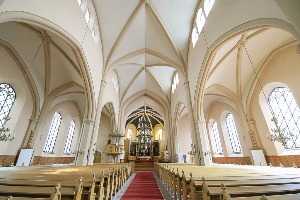 Uusgotiikka vaikutti myös sisätilojen suunnitteluun. Värisävyt muuttuivat vaaleammiksi ja kirkonpenkitkin tehtiin ajanmukaisiksi pyöristämällä päädyt. Penkit maalattiin tammipintaa jäljitellen.