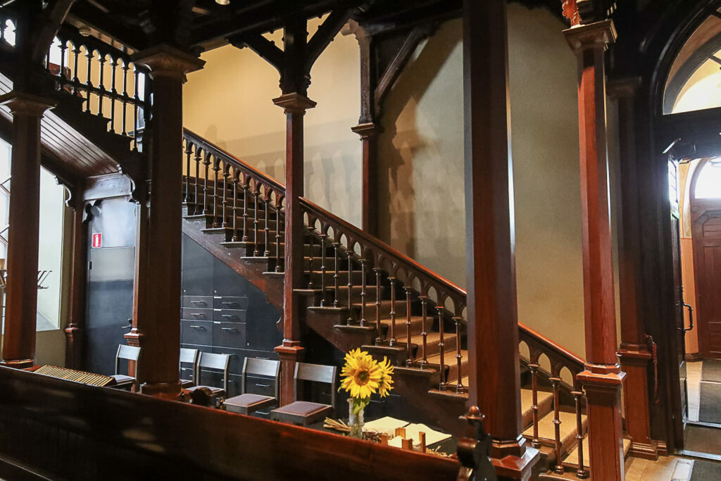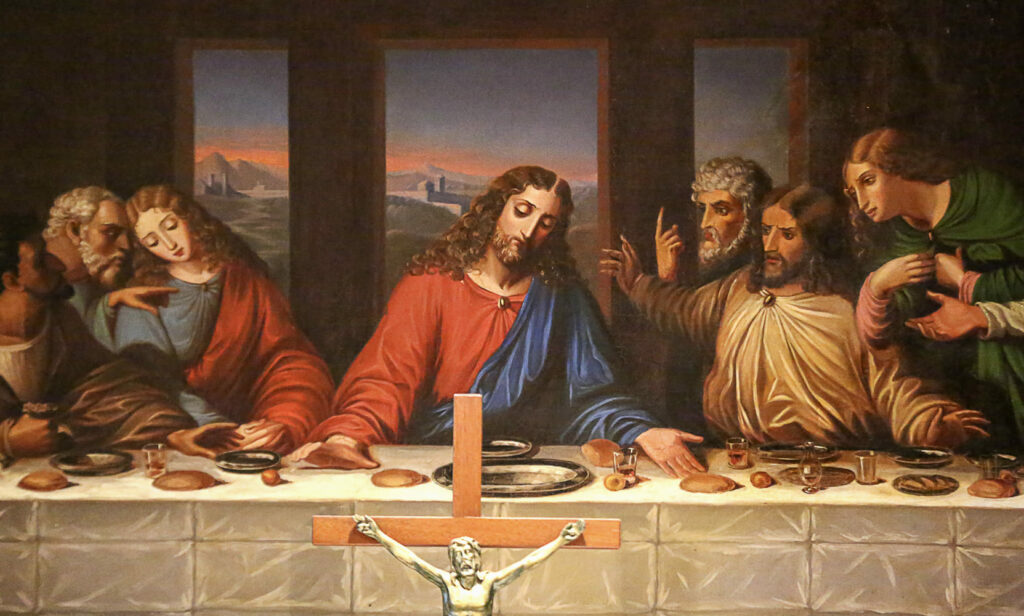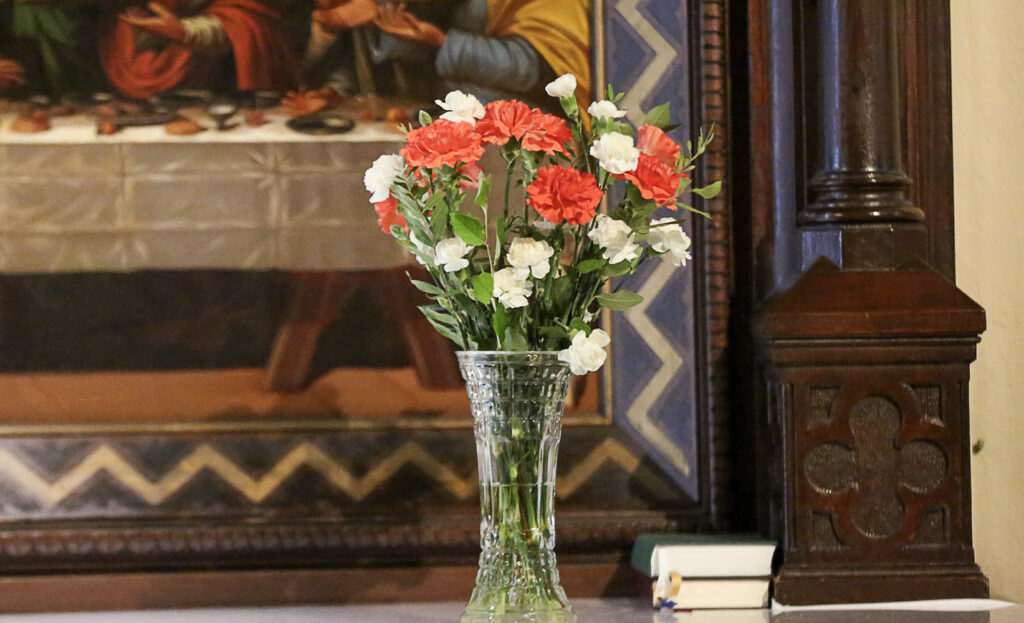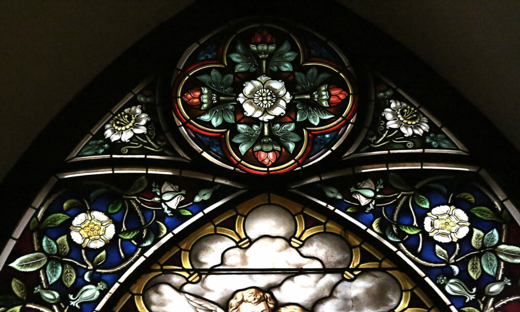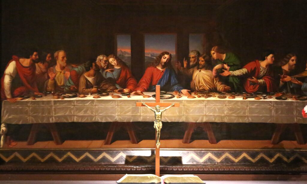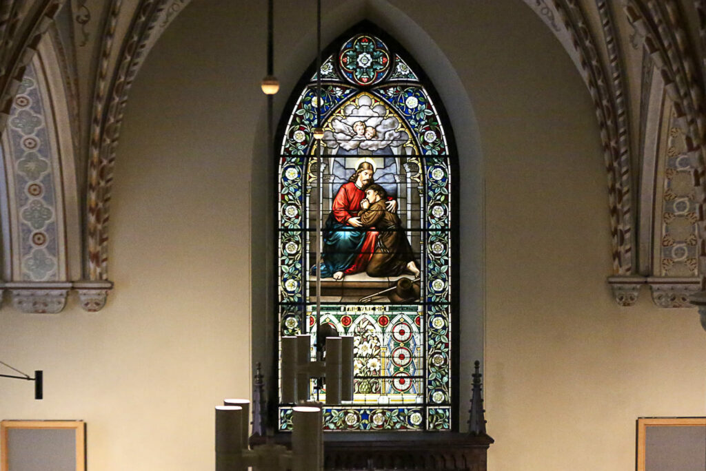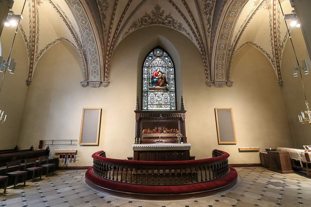 Todellinen katseenvangitsija on kuori-ikkunan värikäs lasimaalaus, joka esittää Jeesusta lohduttamassa pyhiinvaeltajaa. Tämän alapuolella on Leonardo da Vincin Pyhää ehtoollista jäljittelevä maalaus. Sen tekijä on mahdollisesti Robert Wilhelm Ekman. Hän oli eräs maamme tunnetuimpia 1850-luvun kuvataiteilijoita. Muun muassa Turun tuomiokirkon näyttävät freskot kirkon kuoriosassa on hänen tekemät.