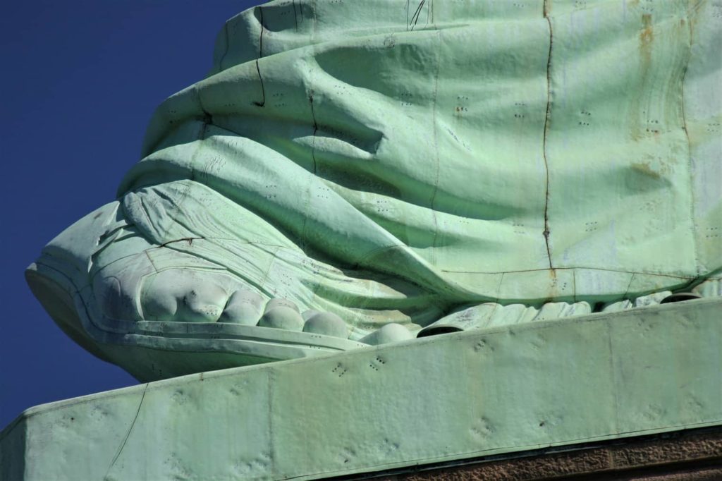 Lady Libertyn kädessä on itsenäisyysjulistuskirja, johon on roomalaisin numeroin ikuistettu Yhdysvaltain itsenäisyyspäivän päivämäärä (4.7.1776).