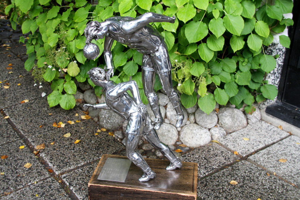 Patsaan patinoituneeseen jalustaan on ikuistettu mestarijoukkueiden nimet. HJK on kaiverrettu jo yksitoista kertaan. Kahdestoista on tulossa myöhemmin syksyllä. Vain kerran laatasta löytyy turkulaisen seuran nimi: FC Inter v. 2008.
