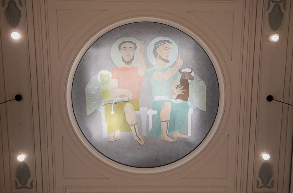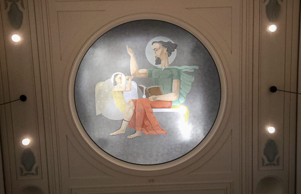 Todennäköisesti kirkkosalin mieleenpainuvin yksityiskohta löytyy katsetta nostamalla. Kattoa koristavat kolme suurikokoista maalausta. Ne peittävät suuren osan kirkkosalin kattopinnasta. Raamatullisin aihein maalatut teokset ovat tehneet koristemaalarit Eino Kauria ja Eino Rapp. Parivaljakon työnjälkeä voi ihailla myös kirkon eteisaulassa.