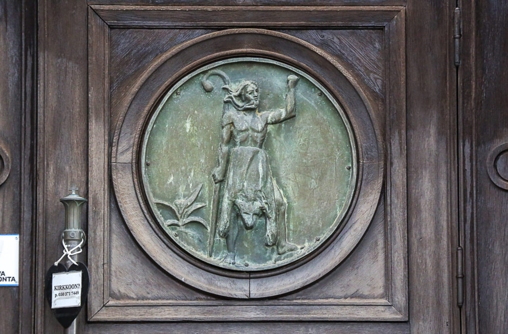 Sama taiteilija on vastannut myös kirkon puisen pääoven pyöreistä korkokuvista. Oven metalliset koristeet tekevät sisäänkäynnistä komean. Olo on kuin astuisi ylisuuresta ulko-ovesta kreikkalaiseen temppeliin.