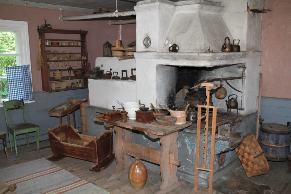 Esillä on muun muassa patakoukkuun ripustettu pata lieden yläpuolella, kirnuja, kahviprännäri, vohvelirauta ja erilaisia kuppeja sekä kiuluja. Päre on asetettu pärepihtiin. Lattialla on reikätuoli pienten lastenhoitoa varten.